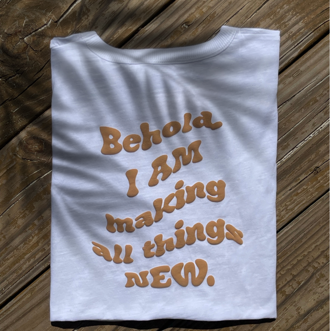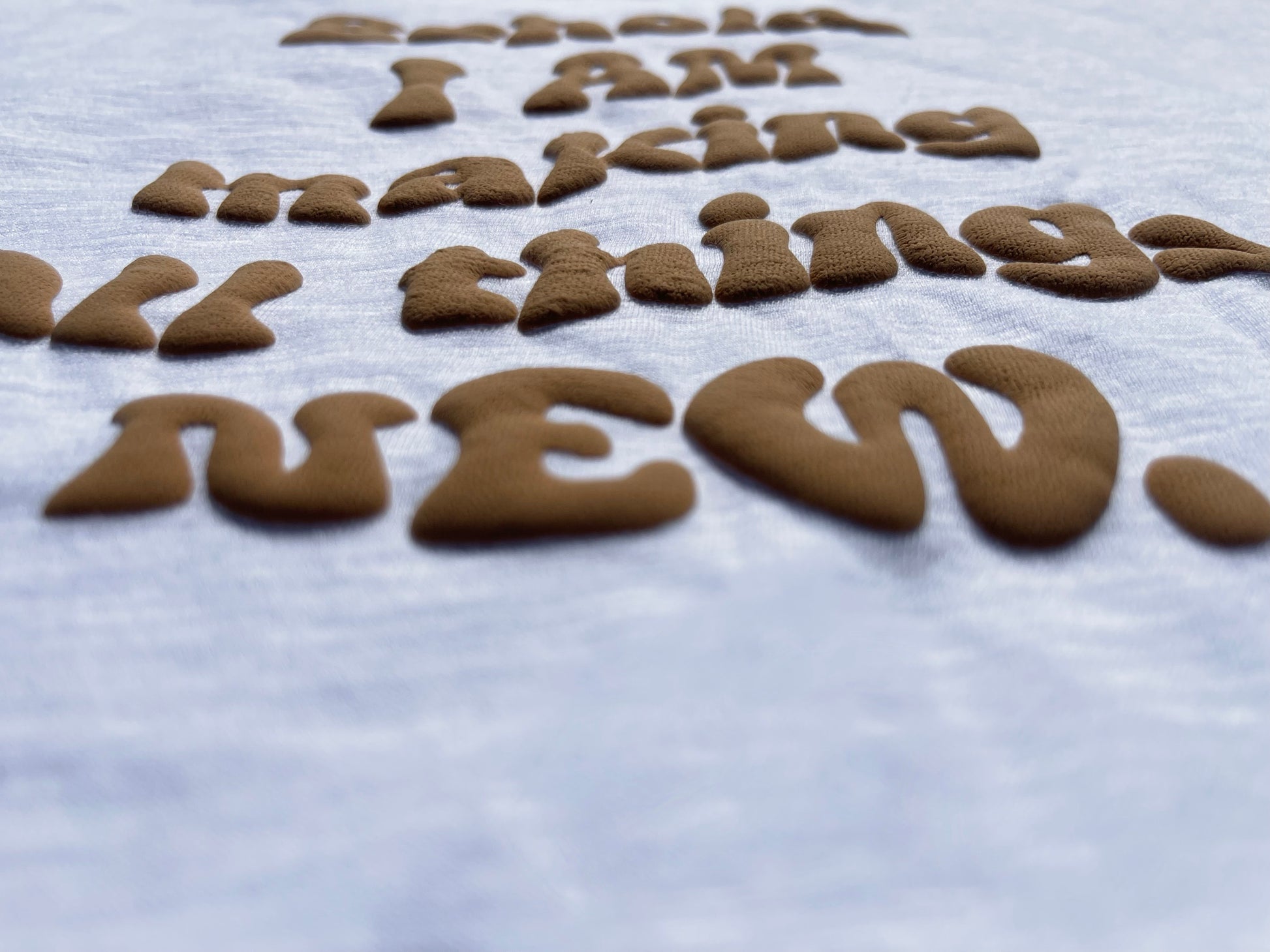 Our abstract new creation heart graphic in PUFF 3-D on a comfy loose v-neck pocket tee.